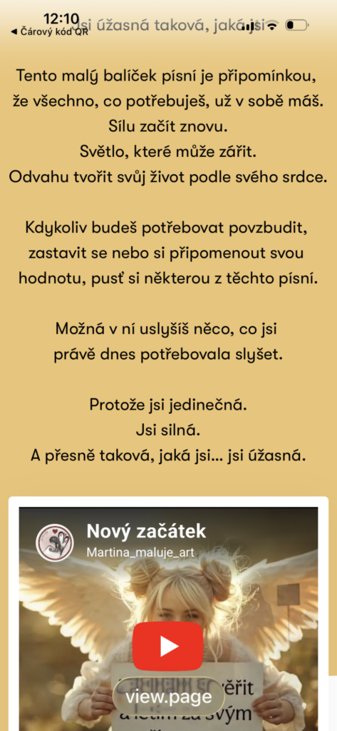 Kartička s QR kódem ti otevře pět inspirativních písní, které můžeš poslouchat kdykoliv potřebuješ povzbudit, zastavit se nebo si připomenout svou sílu. Stačí naskenovat kód a nechat hudbu, aby tě na chvíli provedla zpět k sobě. Malá kartička, která může přinést velké světlo do tvého dne.. na A4 jsou 4 velikosti na stažení...vytiskni, vystřihni a dej do lamina