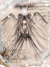 Noty v pozadí symbolizují melodii tvého života – někdy tichou, jindy divokou. A anděl stojí přesně v jejím středu, klidný, jemný, pevný. Připomíná ti, že i když cesta není vždy rovná, tvé sny mají své místo. A že radost není odměna na konci – ale něco, co si smíš dovolit už teď.