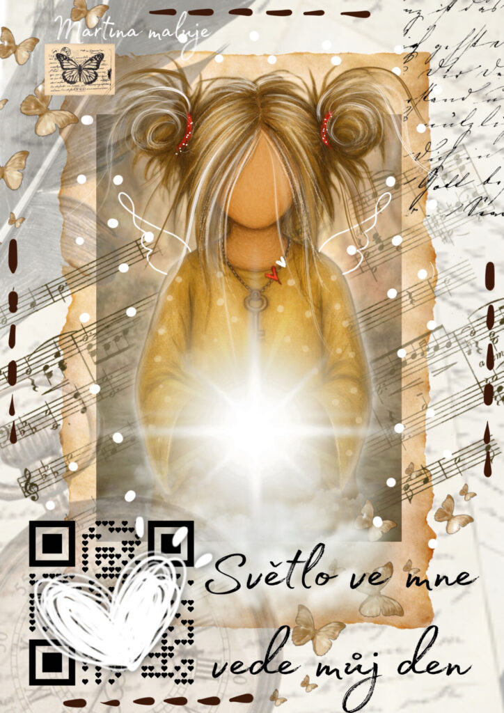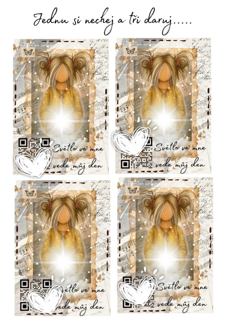 Malá andělská karta s velkou myšlenkou. Vytiskni čtyři karty, jednu si nech pro své ráno a tři pošli dál. QR kód tě zavede na neveřejné video s písní Ranní modlitba.