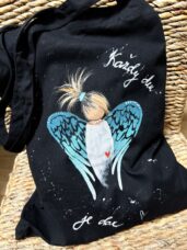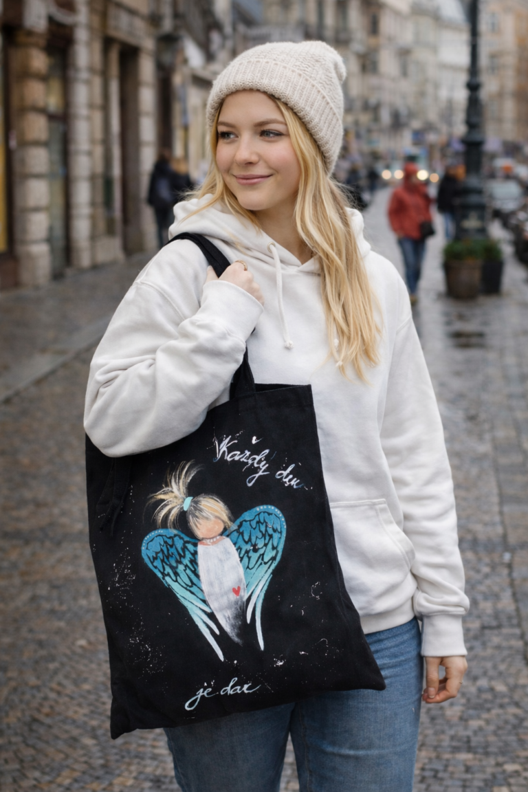 Taška na cokoliv, vždy se hodí mít ji po ruce.. vytáhneš z kabelky, nandáš co potřebuješ a ještě uděláš parádu... jde o ruční malbu barvami na textil, které jsou zažehlené. Text: Každý den je dar...