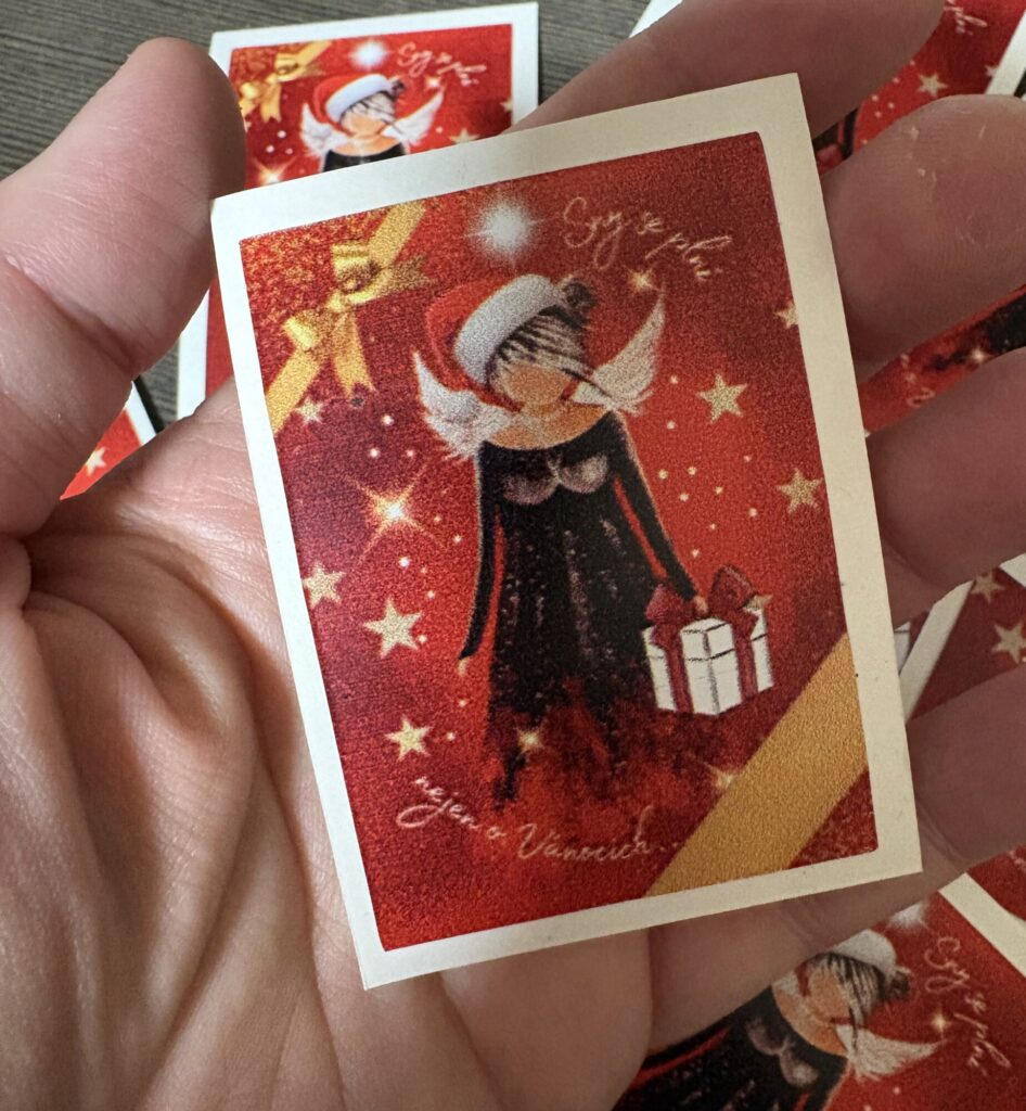 Voděodolná samolepka 7x5 cm, kde můžete dopsat jméno fixem do zlatého rohu... vhodný na vánoční balíček... prodáváme po 10 ks. Cena 149 Kč je za sadu 10 ks (můžeš si dokoupit Andělku online, záložku a přání.. viz text dále)